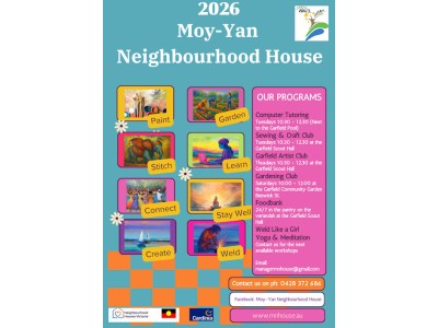 Programs, support and social connection for everyone in Garfield and West Gippsland Rail Towns. Our Mission: Supporting and strengthening the local community by providing a positive, safe and inclusive environment where people can make friends, learn a new hobby, or get support. Our Vision: A community strengthened by services, activities, and opportunities that promote health, empowerment, resilience, inclusivity, and social connection. Our Programs: Check our up-to-date Program Calendar for the latest dates Visit our YouTube Channel for more detailsMoy-Yan Neighbourhood House