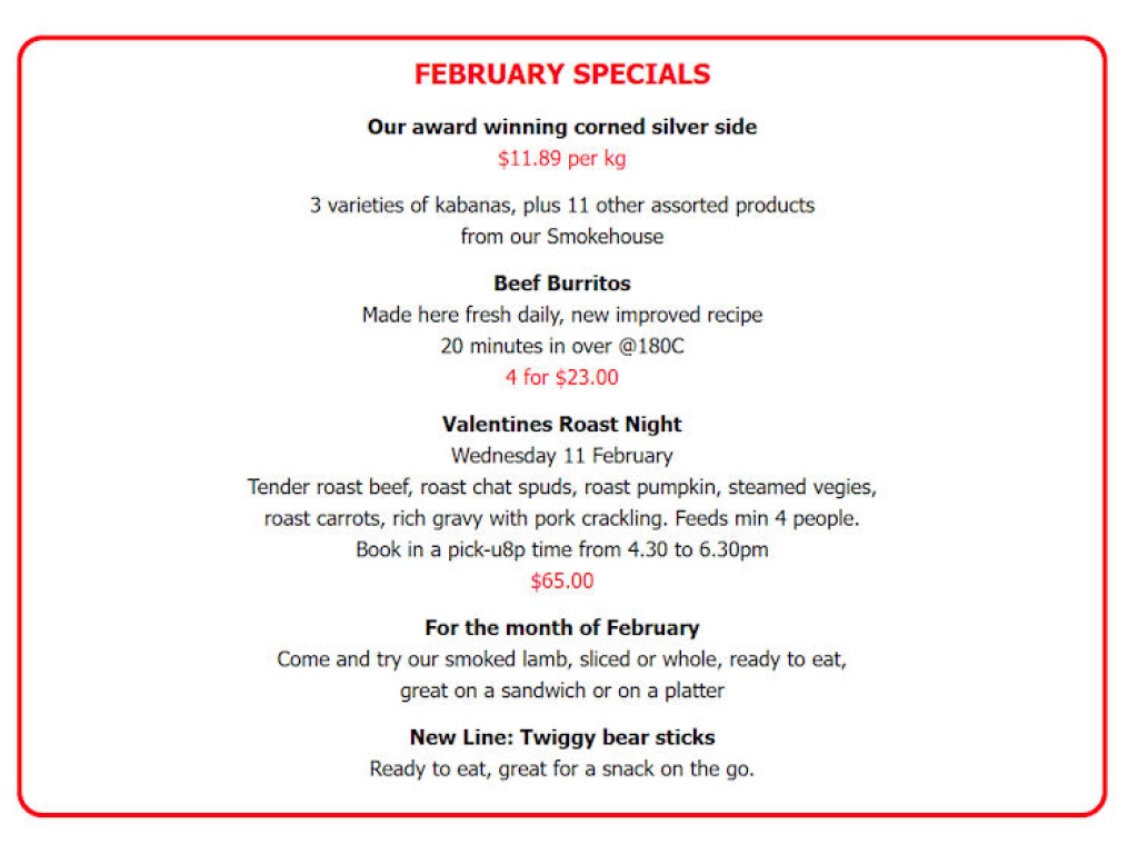 Our award winning corned silver side 3 varieties of kabanas, plus 11 other assorted products Beef Burritos Valentines Roast Night For the month of February New Line: Twiggy bear sticksFEBRUARY SPECIALS